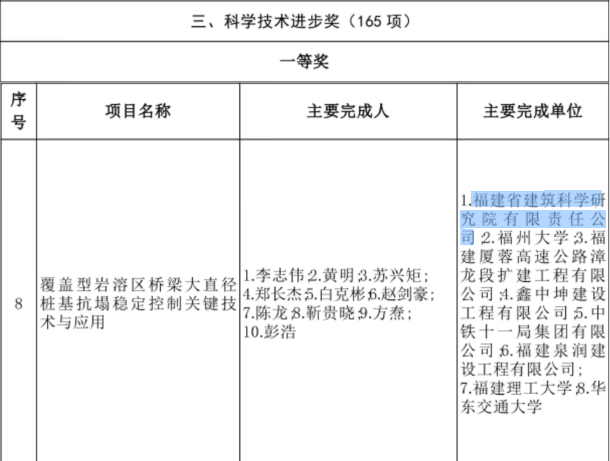 近日,2023年度福建省科學技術獎獲獎名單重磅揭曉,福建建科院作為第一完成單位,李志偉作為第一完成人,趙劍豪共同參與的研究項目《覆蓋型巖溶區橋梁大直徑樁基抗塌穩定控制關鍵技術與應用》榮獲省科學技術進步獎一等獎,進一步彰顯了我司在巖土及地基基礎領域卓越的研發實力和技術創新水平。