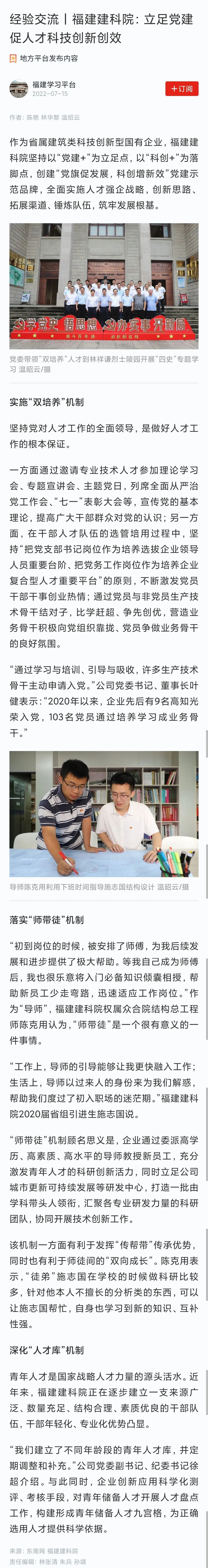紅七月,福建建科院黨建促發展的舉措及成效獲主流媒體關注報道。7月15日,學習強國福建學習平臺刊發題為《經驗交流丨福建建科院:立足黨建 促人才科技創新創效》的文章。
