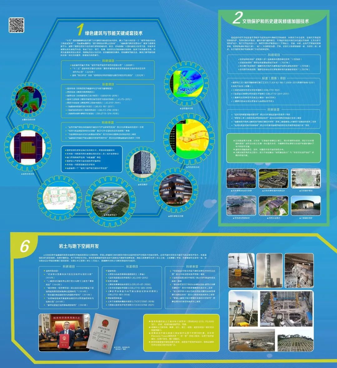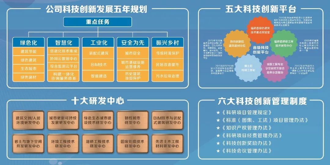 作為福建建工科技創新的重要依托平臺和我省建設行業科研龍頭企業,福建建科院擁有實力雄厚的專家團隊和成熟的科技創新體系,基于“頂層目標牽引、重大項目帶動、基礎能力支撐”科技運行機制,依托五大省級創新平臺和十大公司研發中心,在“綠色建筑與節能”、“文物保護和歷史建筑修繕加固”、“城市安全”、“智慧城市和新型工業化”、“綠色建材及固廢處理”、“巖土及地下空間開發”六大領域開展技術研究,已完成科研成果150余項,正式出版的主、參編標準及工法圖集等230余本,擁有國家專利100項,獲省部級科技獎68項,其中近5年獲得國家技術發明二等獎1項,省級科技進步一等獎2項、二等獎3項、三等獎2項,省標準貢獻獎二等獎1項,科技成果產業化成效顯著。