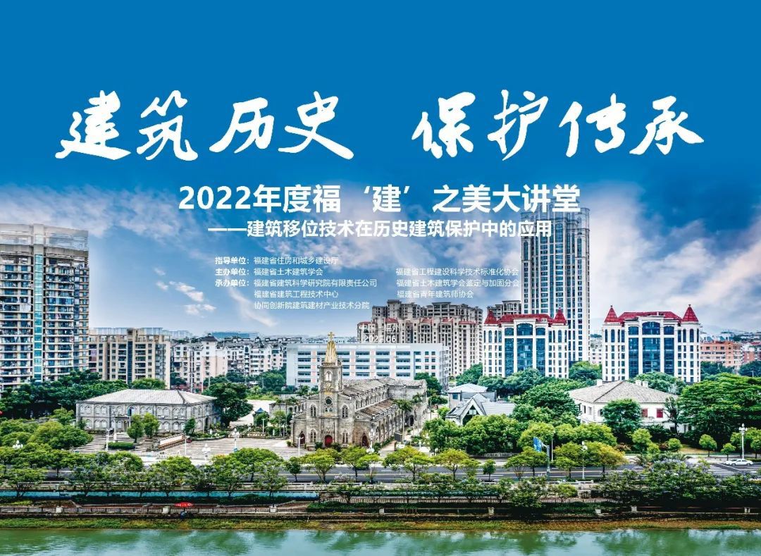 6月10日下午,由福建省建筑科學研究院有限責任公司(以下簡稱“福建建科院”)為主承辦的2022年度福‘建’之美大講堂系列活動第七場“建筑歷史 保護傳承——建筑移位技術在歷史建筑保護中的應用”主題講座在福州三坊七巷全國優秀建筑設計展示館(郎官巷23號)順利舉行。
